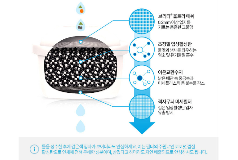 브리타 필터 내부에는 정수 과정에 필요한 활성탄이 있는데 이 활성탄 가루가