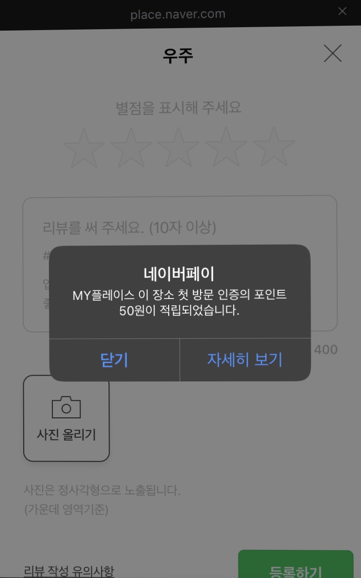 대신 마이 플레이스에 최초로 리뷰를 남기시는 경우 1,3,5,7,10번째 까지는 무려 500원이 적립됩니다.