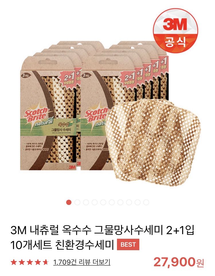 제가 처음으로 플라스틱 수세미 대신 사용했던 제품은 3M에서 출시한 이 제품입니다. 보통 옥수수 전분 수세미로 알고 계신 그 제품이에요. 작년 마트에서 처음 발견하고는 바로 구매해서 사용해보았어요.