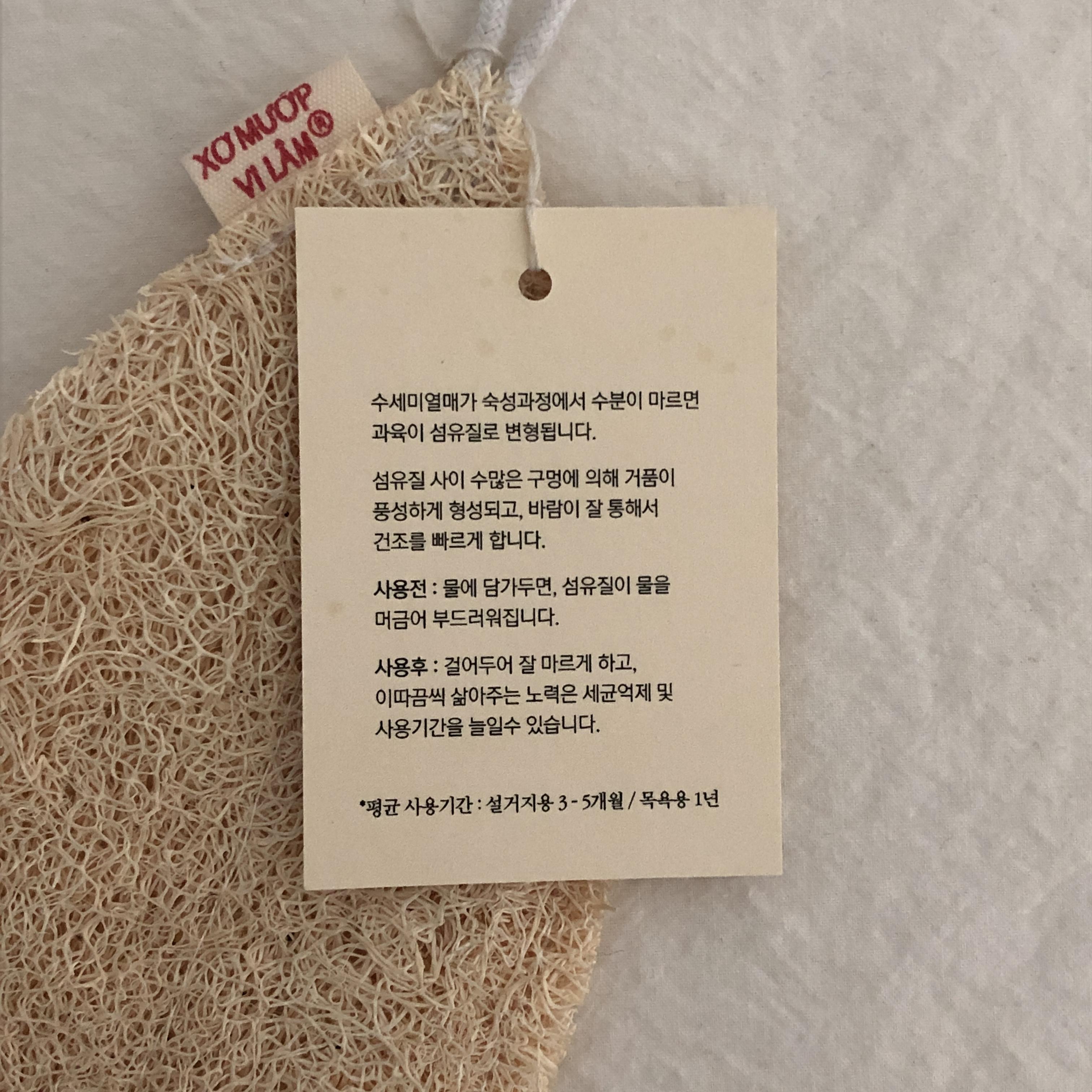 홈페이지에 친절한 설명을 살펴보니 이 수세미는 천연 수세미 열매를 수확 후 건조하여 순면 100프로 실로 박음질하여 만든 것이라고 합니다. 박음질하는 실 하나까지 환경을 생각하는 마음이 담겨있는 제품입니다. 요즘 합성섬유가 어마어마한 미세 플라스틱을 만든다는 이야기를 듣고 앞으로는 옷 하나를 사더라도 면제품을 구매해야겠다는 다짐을 했었습니다. 이 수세미는 건조된 수세미 열매 과육과 순면으로 만들어졌으니 사용 후 자연으로 모두 돌아갈 수 있을 것 같습니다. 달려있는 라벨 역시 코팅이 없어 재활용 가능한 종이 같아요.