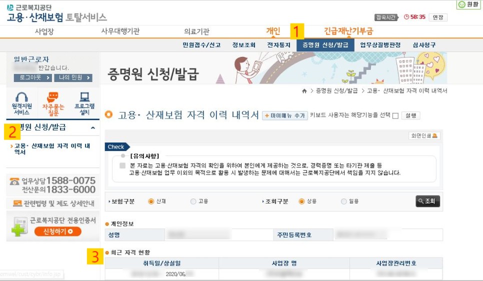 개인 > 증명원 신청/발급 > 고용 산재보험자격 이력 내역서 > 상실 일자 확인