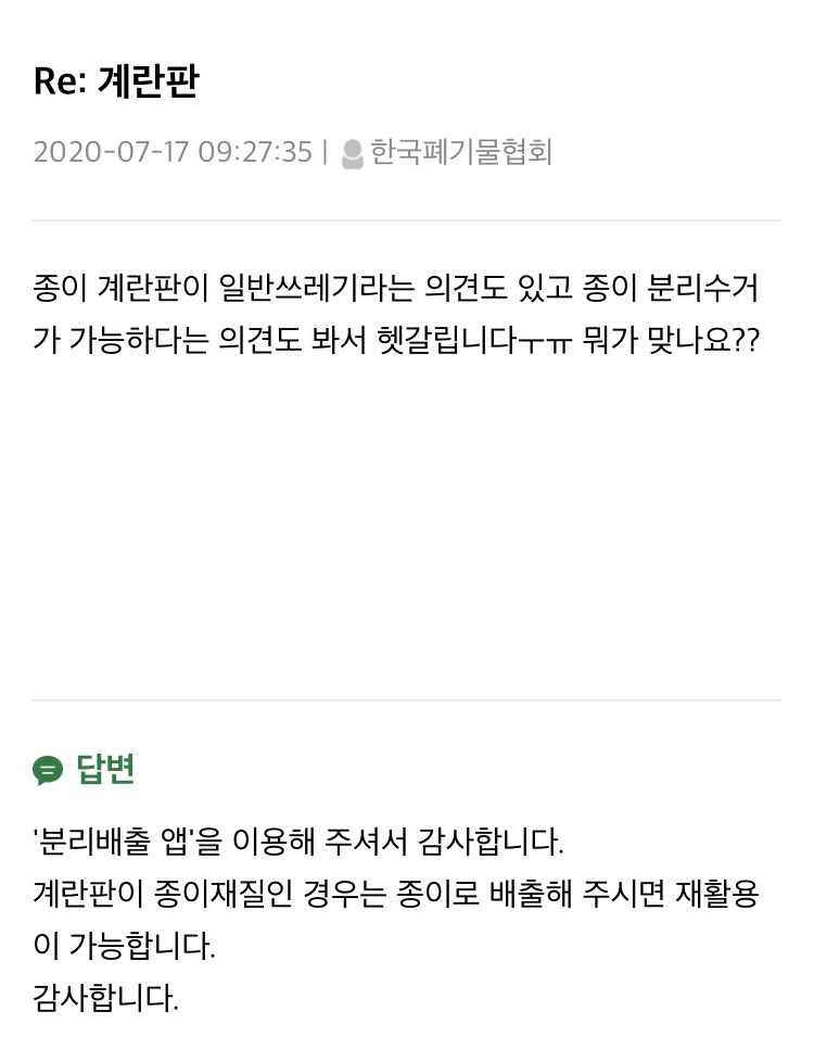 이번에 장을 보면서 계란 한 판을 구매했답니다. 종이팩에 포장된 계란을 구매했는데 겉에 이런 포장지가 하나 더 있어요. 만져보니 표면이 매끈거리는 종이였습니다. 지금까지 저는 이렇게 코팅된 종이는 재활용이 어렵다고 알고 있었습니다. 그래서 이것 역시 종량제 봉투로 버리려고 했어요.