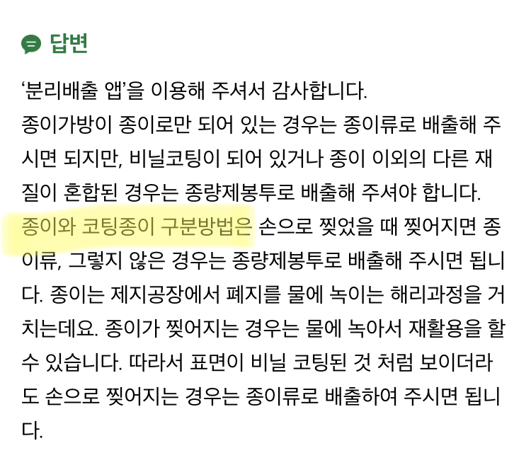 한번 찢어보았습니다. (유리병 같은 자원은 깨지게 되면 재활용이 불가능합니다. 주의해주세요! 종이는 녹여서 재활용되기 때문에 형태가 변형되어도 괜찮을 것 같습니다.)