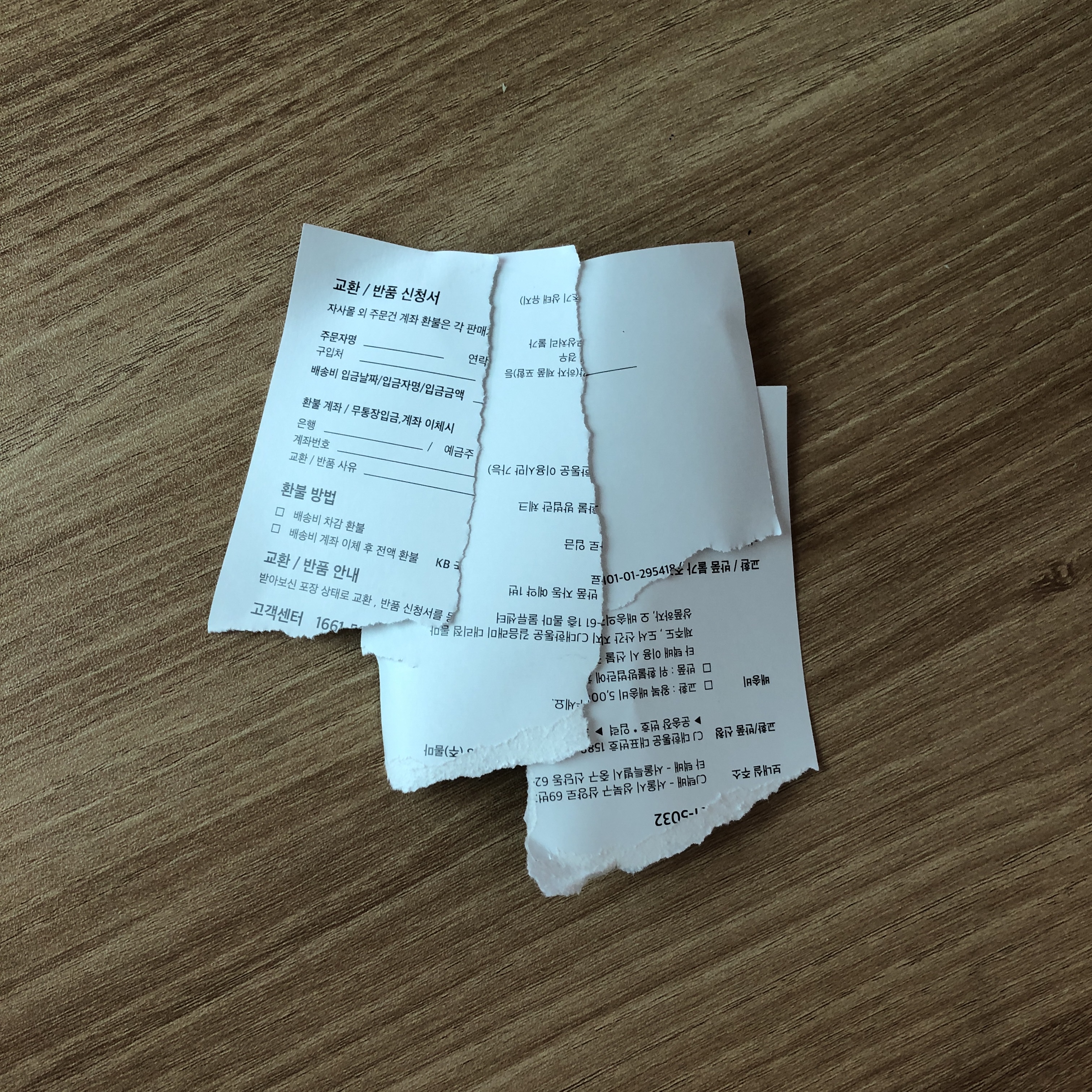 얼마 전 올해 처음으로 새 옷을 구매하고 함께 받은 교환 환불 용지입니다. 이 종이 역시 표면이 매끄럽게 코팅된 것처럼 보입니다. 하지만 분리배출 앱에서 안내해주신 대로 '찢어지면' 물에 녹이는 해리 과정이 가능하기 때문에 종이류로 배출이 가능하다는 사실!