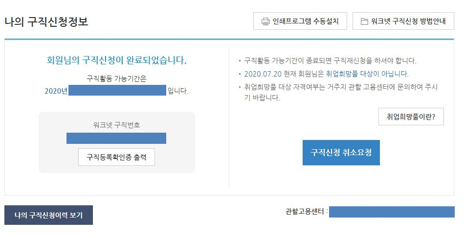이력서 등록 후 3번으로 가시면 바로 구직신청이 가능합니다. 원하는 업무, 장소등을 선택하시고 구직신청을 완료하시면 됩니다. 화면처럼 구직신청이 완료되시면 구직등록 확인증도 출력이 가능합니다. 하지만 실업급여 신청에는 따로 필요하지 않으니 출력하실 필요는 없습니다.