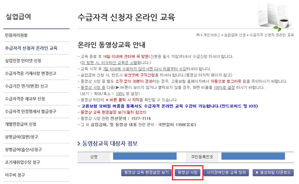 고용보험 사이트 로그인 > 수급자격 온라인 교육 > 동영상 시청