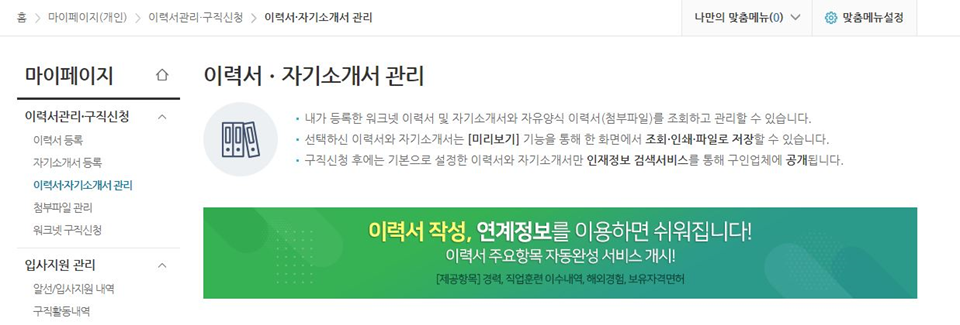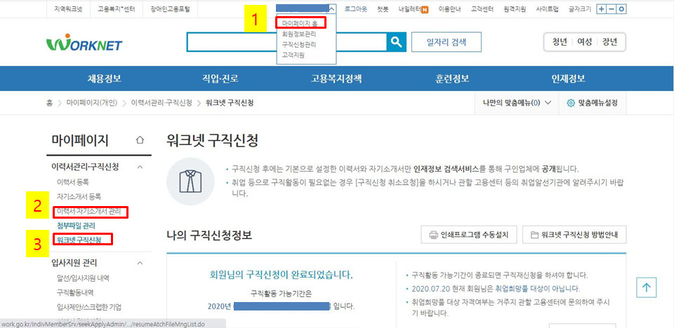 구직 신청을 하기 위해서는 워크넷에 본인의 이력서가 등록되어 있어야 합니다. 2번에 들어가셔서 이력서를 등록해주세요. 자기소개서도 선택적으로 등록 가능합니다.