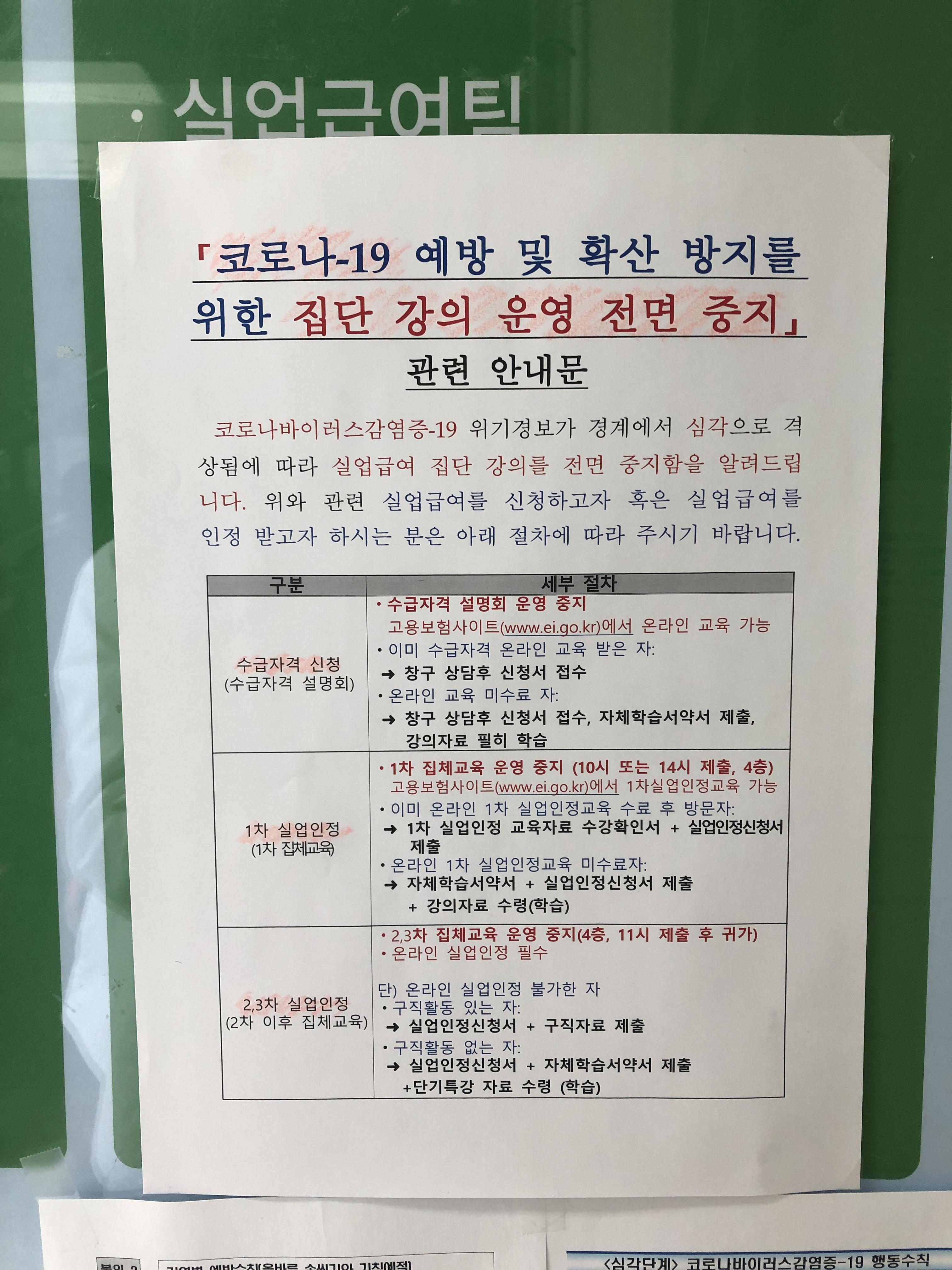 제가 방문한 수원 고용복지 플러스센터에 도착하니 사진처럼 집단 강의 전면 중지 안내가 있습니다. 코로나 19 확산을 예방하기 위해서 오프라인 수업은 대부분 중단된 듯합니다. 대신 인터넷으로 대체가 가능하니 재취업 활동에 더 집중할수 있겠습니다.