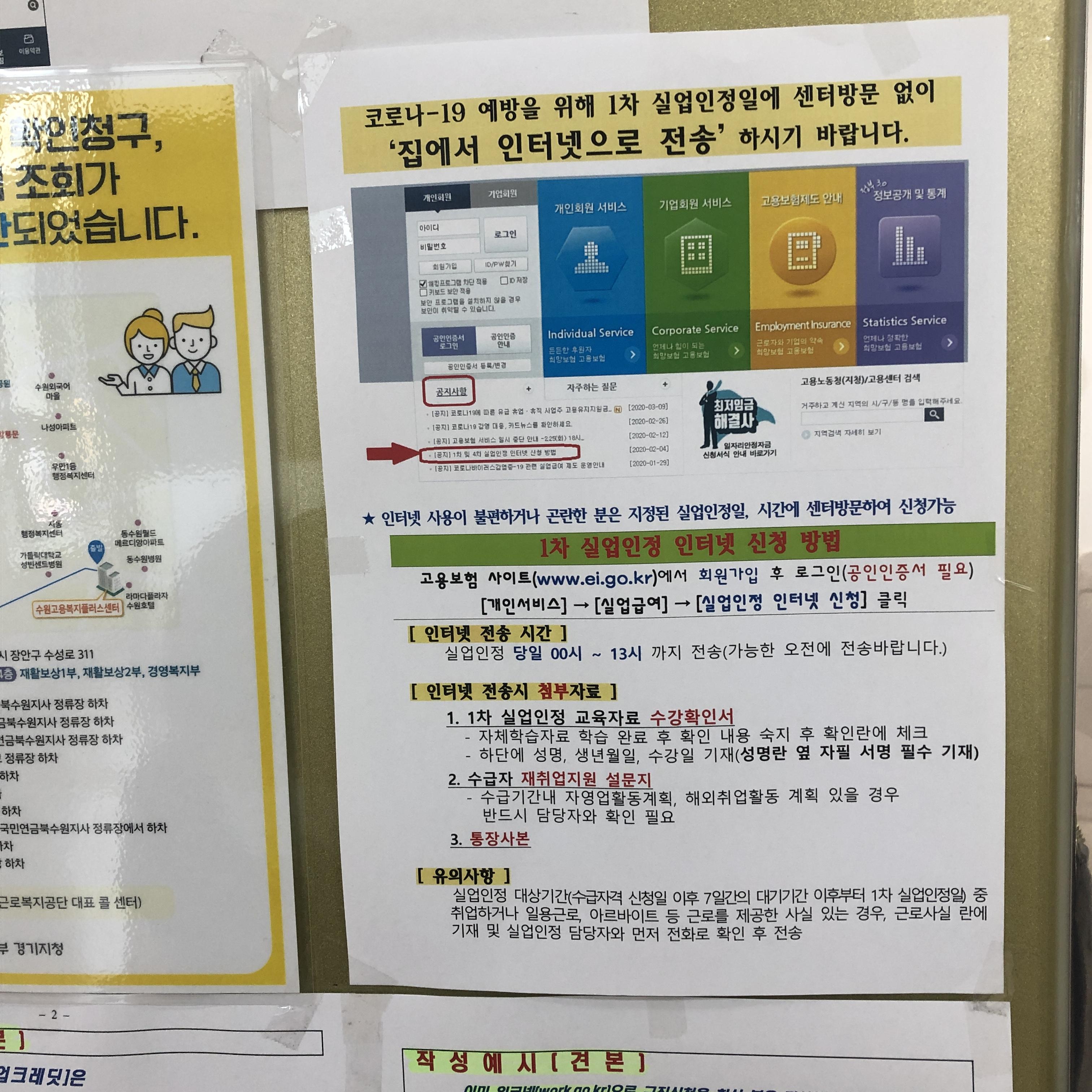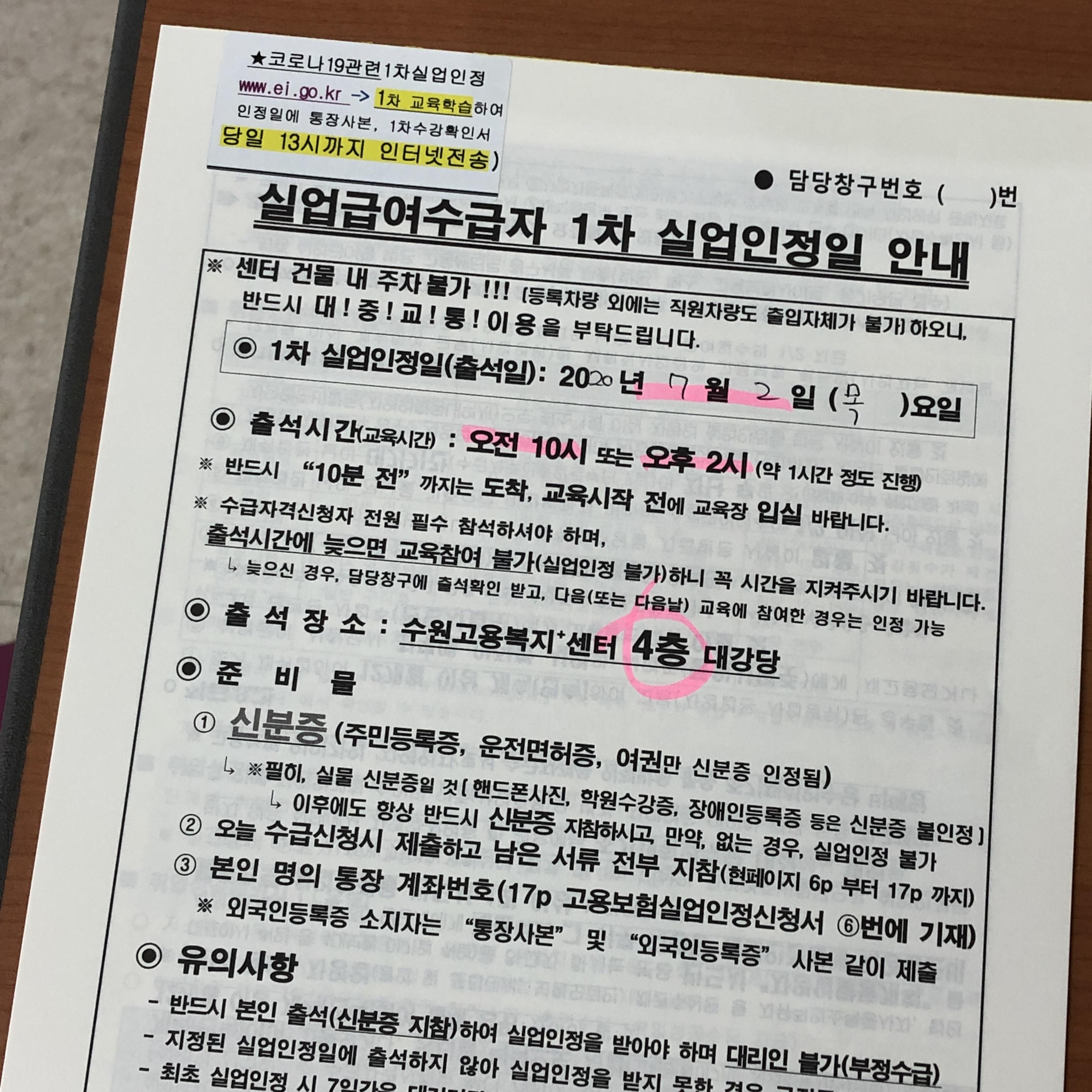 신청이 끝나면 사진의 좌측 상단에 보이는 것처럼 스티커를 붙여주셨습니다. 코로나 19 때문에 오프라인 교육이 대부분 온라인 교육으로 변경되었습니다. 때문에 실업인정 신청 역시 언제, 어디서 해야 하는지 친절하게 알려주셨어요. 하지만 모든 신청자가 온라인으로 가능한 것은 아니고 전날까지 도착하는 문자에서 정확히 알려준다고 하십니다. 만일 문자로 오프라인 출석이 요구되는 경우에는 고용센터에 다시 방문하셔야 합니다.