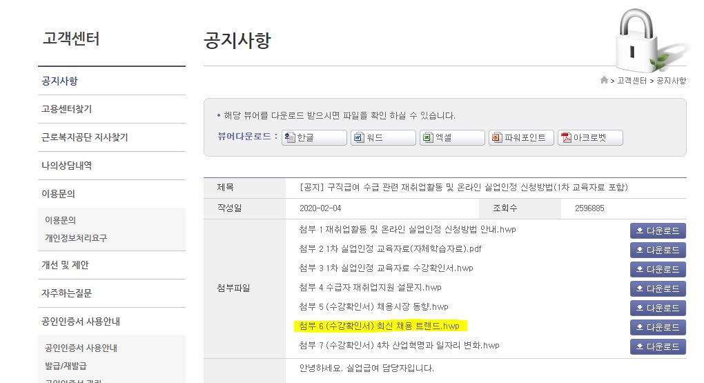 수강 확인서는 공지사항에서 이렇게 다운로드가 가능합니다. 저는 이번에 최신 채용 트렌드 특강을 수강하였기 때문에 첨부파일 6번을 다운로드하여 작성하여 첨부했습니다. 여러분도 자신이 수강한 특강 내용에 맞는 수강 확인서를 다운로드하여 작성하시면 됩니다. 온라인 제출의 경우 서명은 생략하셔도 무방합니다.