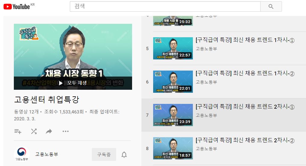 취업특강은 다음과 같이 준비되어 있습니다. 한 가지 주제에 4개의 영상으로 구성되어 있습니다. 4개의 영상을 모두 들어도 2시간이 넘지 않으니 편리하면서도 감사했습니다. 저처럼 채용 공고 자체가 없는 사람이라면 정말 효율적인 방법이라고 생각합니다.